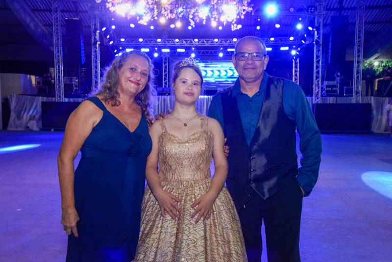 Márcia Pina, ao lado da família.Márcia Pina, mãe de Luisa Camila, com síndrome de Down, compartilhou sua emoção. “Minha felicidade é ver minha filha feliz, e hoje estou extremamente grata à Prefeitura por proporcionar uma festa tão linda para todas essas garotas.”