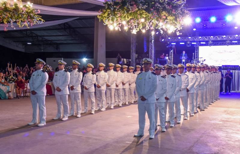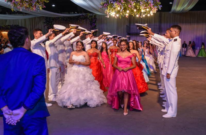 Participação dos cadetes da Marinha.O baile começou em grande estilo com a participação dos cadetes da Marinha, que encantaram familiares, amigos e convidados com seu garbo e cavalheirismo, conduzindo as debutantes com elegância para a abertura oficial da noite.