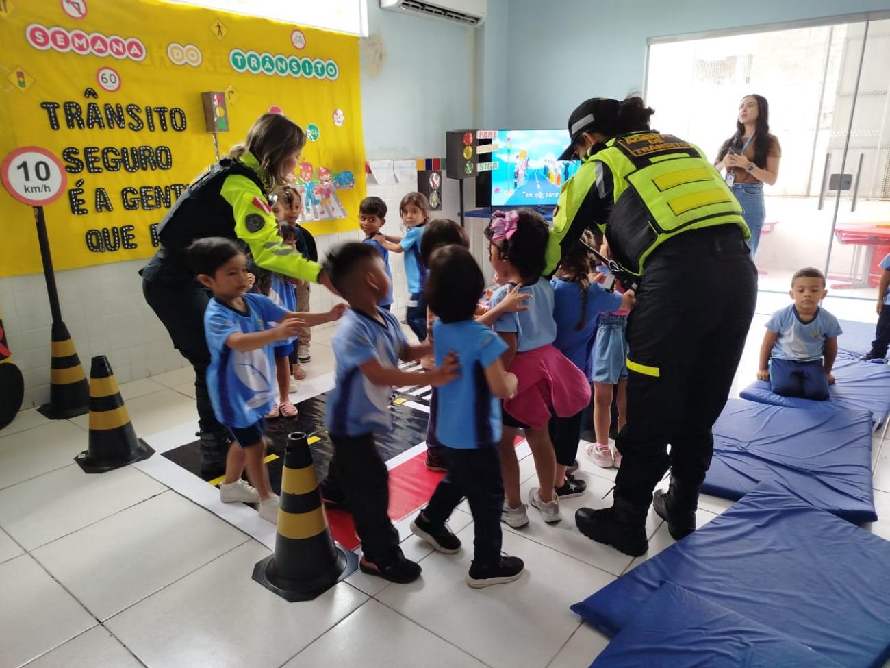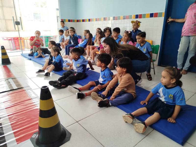 As agentes Ádara e Albuquerque conduziram dinâmicas voltadas à conscientização sobre as noções básicas de trânsito, ensinando de forma lúdica o que as crianças devem ou não fazer para garantir um comportamento seguro nas vias públicas.