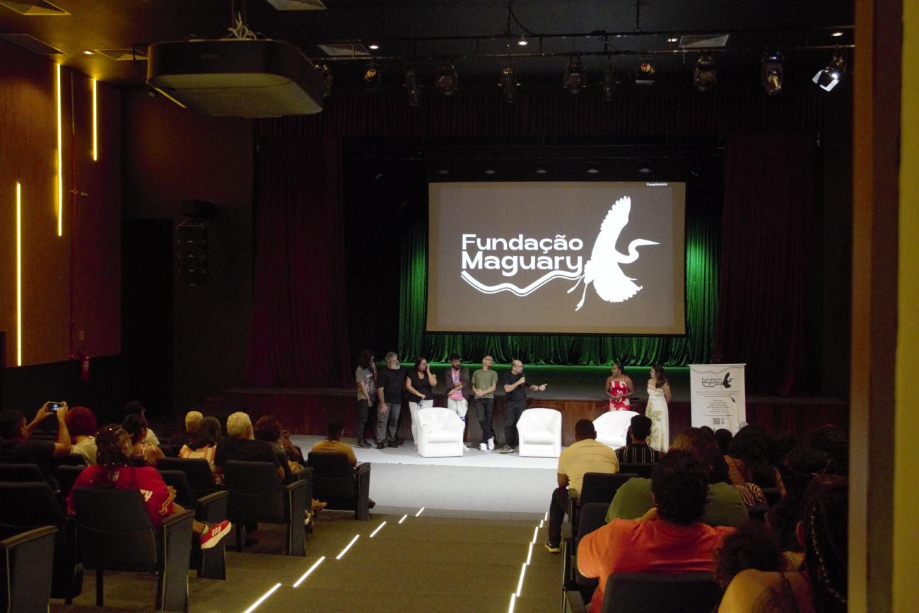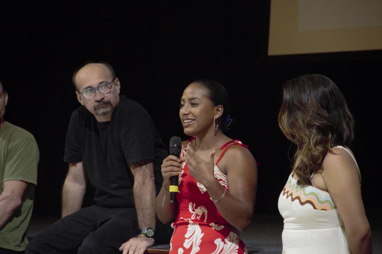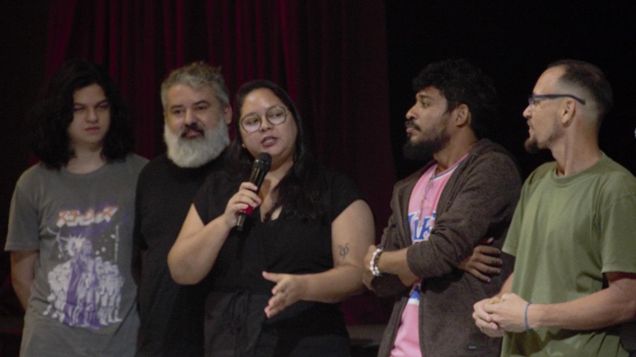 Isa Muria, artista visual indígena.Durante o evento, também foi realizada uma saudação especial aos indígenas presentes, Isa Muria e Miguel Tenetehara, em reconhecimento à importância da presença indígena viva e atuante nos espaços culturais e educativos. Em seguida, os atores do curta “Quem Quer?” foram convidados ao palco para uma saudação ao público.