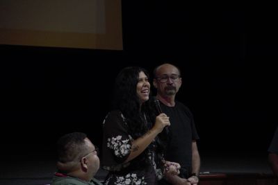 “Fico muito grata pelo convite e parabéns aos novos cineastas que se formaram hoje (...), O Festival Etnográfico é um espaço de identificação e representatividade, então precisamos falar sobre esses espaços de representatividade, e eu queria também saudar a todos os parentes que estão aqui. Essa parceria com o Poraquê foi um encontro, ele é um camarada muito criativo, ele foi escrevendo o roteiro, escrevendo o projeto… e deu certo”, completa Célia Maracajá, diretora do curta “Quem Quer?”.