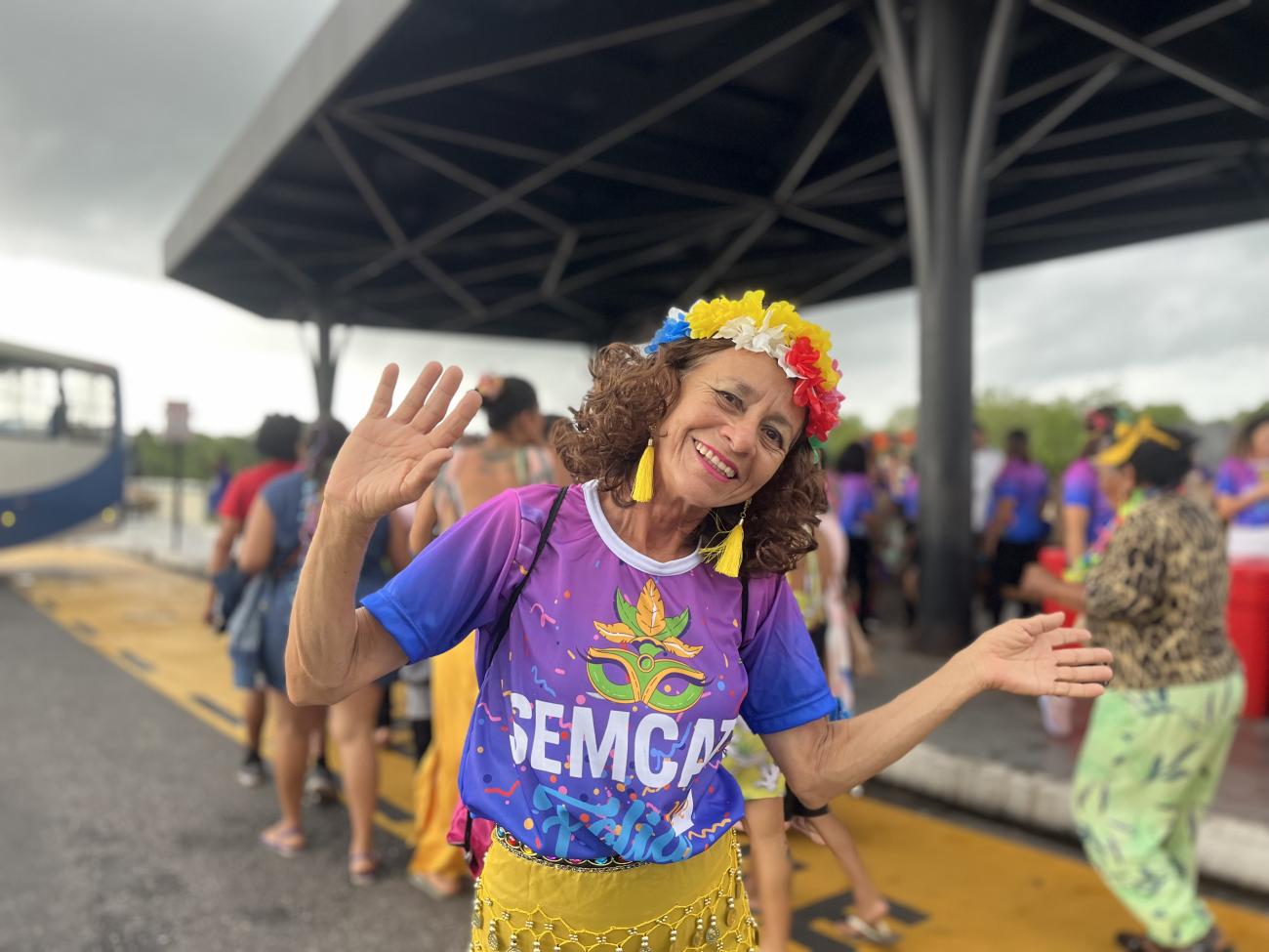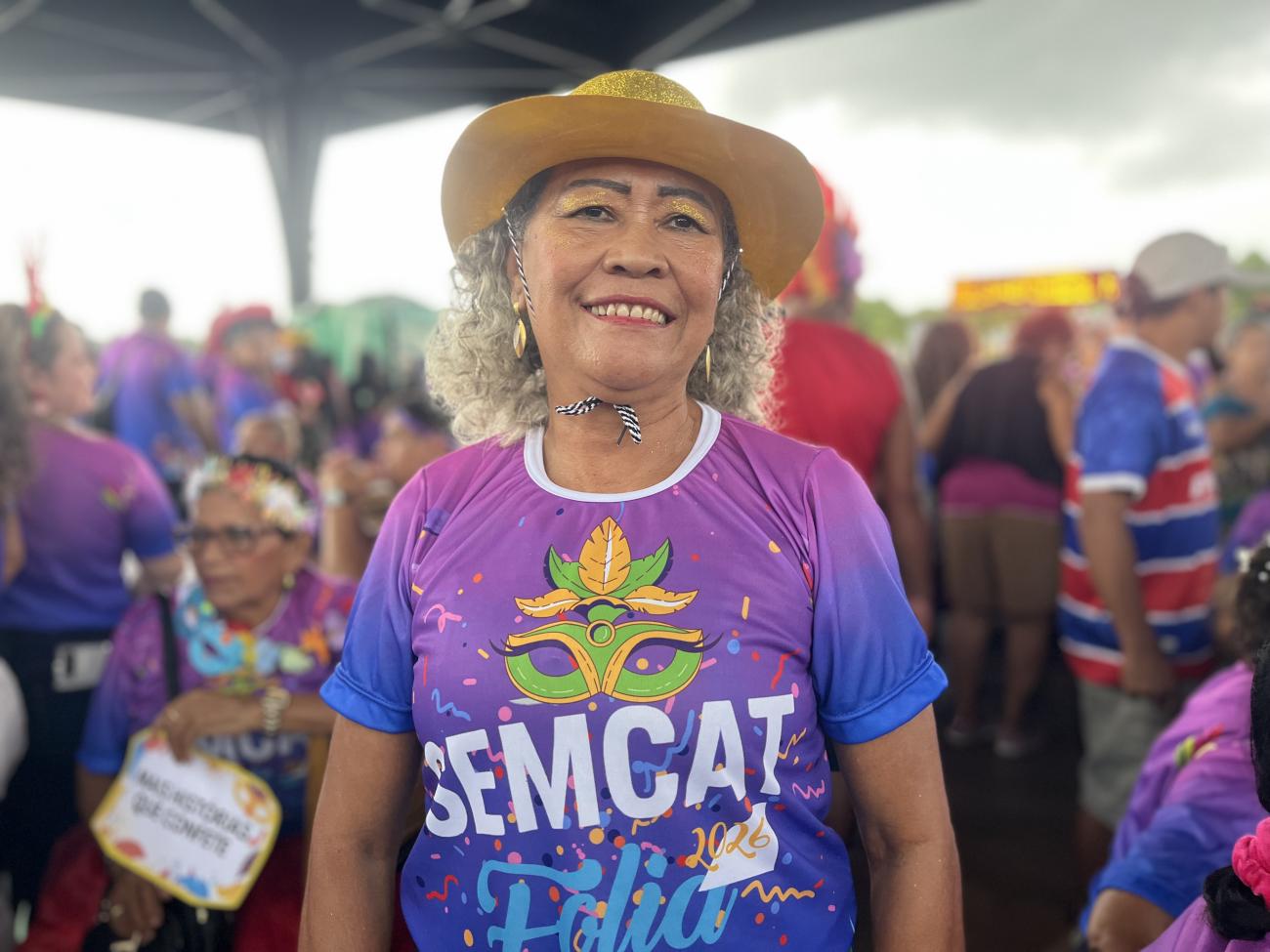 Soraya Corrêa, 63 anos.Entre os foliões, dona Soraya Corrêa, de 63 anos, do CRAS Complexo do VI, não ficou parada. Com um sorriso largo, ela fez questão de participar. “O SEMCAT Folia foi muito bom. Nós dançamos, nós cantamos. Foi a maior alegria que tivemos nessa nossa idade, foi maravilhoso. Palmas para a SEMCAT”, disse, enquanto arriscava alguns passos ao som da marchinha.