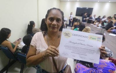 Rosângela Ferreira recendo o certificado de ″Marketing Digital″.A felicidade de Rosângela Ferreira é mostrada com um sorriso. A autônoma de 57 anos está entre os empreendedores que receberam a certificação do projeto “Doces que Encantam”. Moradora do bairro Aurá, na zona sul de Ananindeua, ela trabalha com a produção de doces e salgados há pelo menos três anos e, agora, com a qualificação profissional, pretende expandir o próprio negócio.