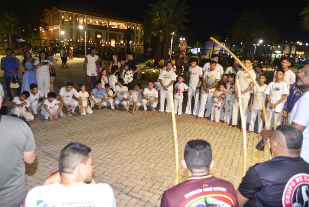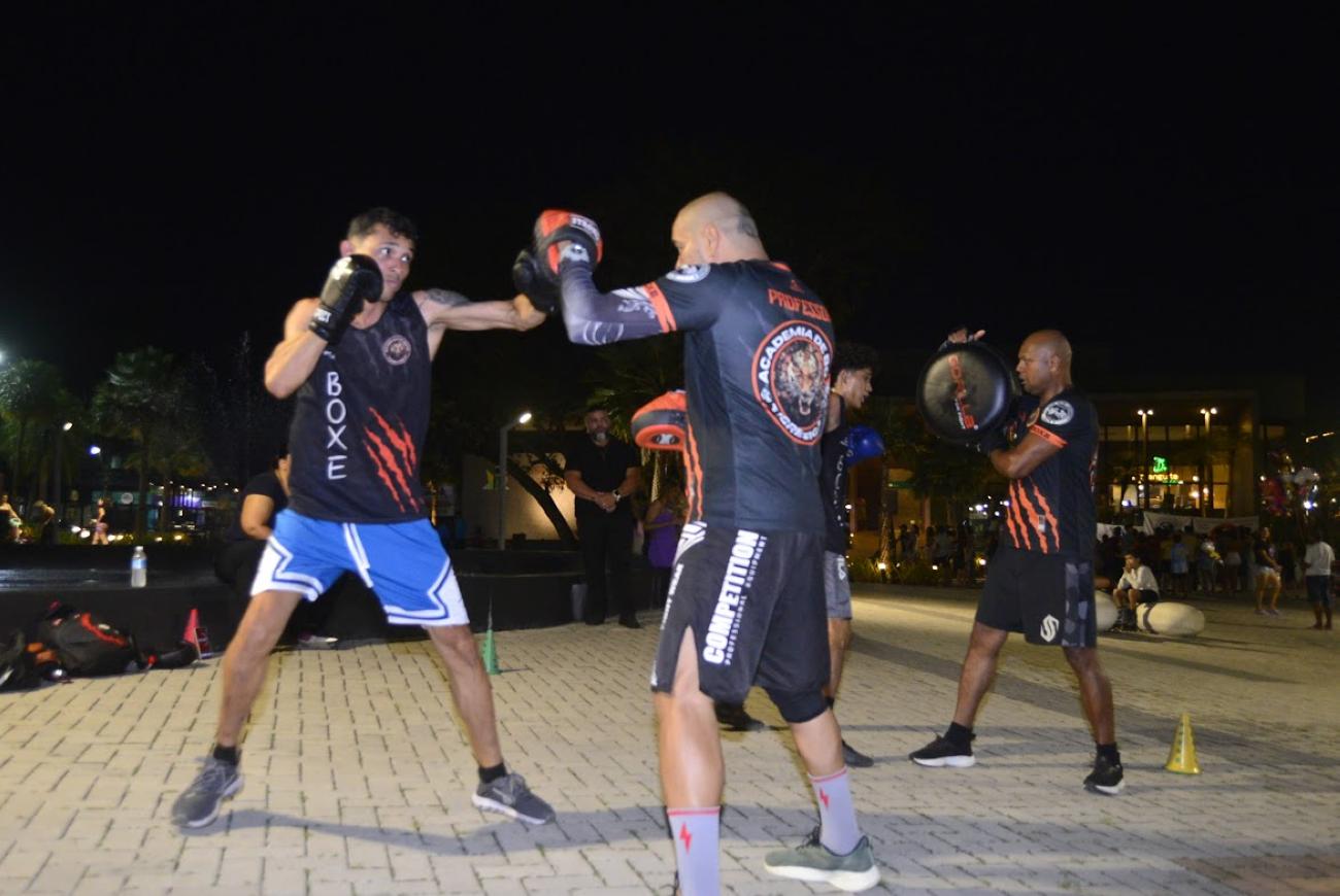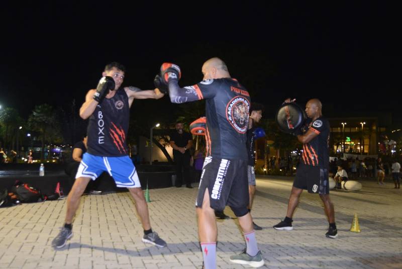 A noite contou com apresentações conduzidas por academias e grupos da região. O grupo Movimento da Ginga levou ao público a capoeira, prática que une luta, música e tradição cultural. No boxe, a equipe Tigres Fight apresentou técnicas de treino e movimentos característicos da modalidade.