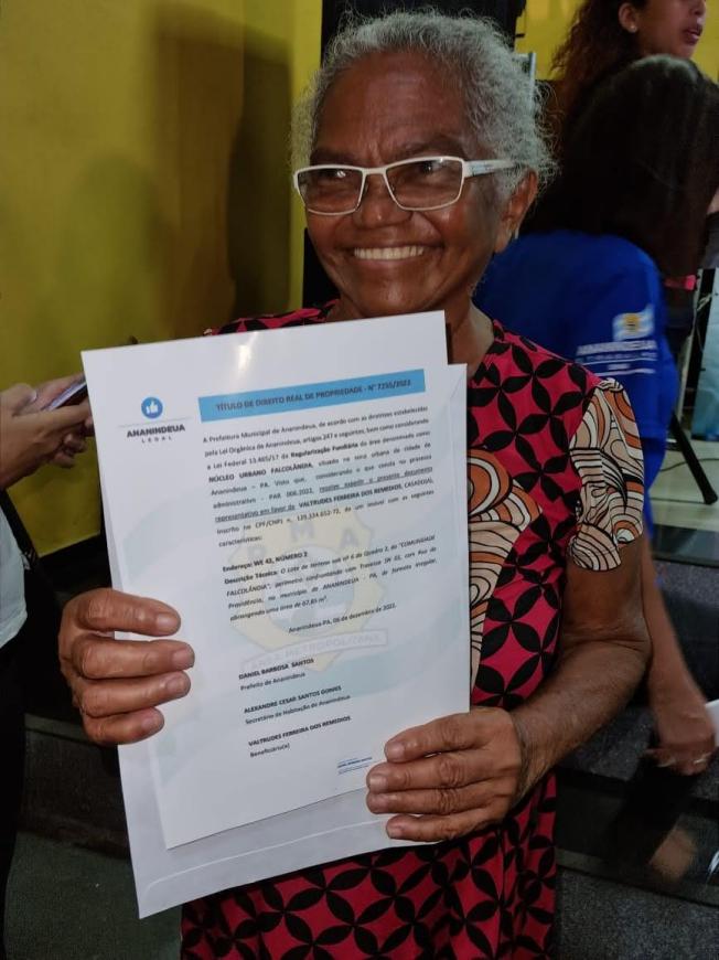A dona de casa Maria do Socorro dos Remédios, 75 anos, também foi contemplada pelo programa Ananindeua Legal. "Agora eu posso dizer que a minha casa é realmente minha e que nunca vou ser despejada. Há quarenta e cinco anos quando viemos pra cá a gente sofreu muito, com as constantes ameaças de despejo, mas agora quando Deus me chamar eu vou deixar a casa e o terreno pros meus filhos. Quero agradecer ao prefeito pela concretização desse sonho", disse Mariaregularização representa uma série de vantagens para os proprietários dos imóveis, garantindo segurança jurídica do imóvel, facilitação na obtenção de financiamentos para melhorias e acesso aos serviços públicos da cidade. Por meio do programa Ananindeua Legal, até agora, já foram entregues 20.370 títulos.