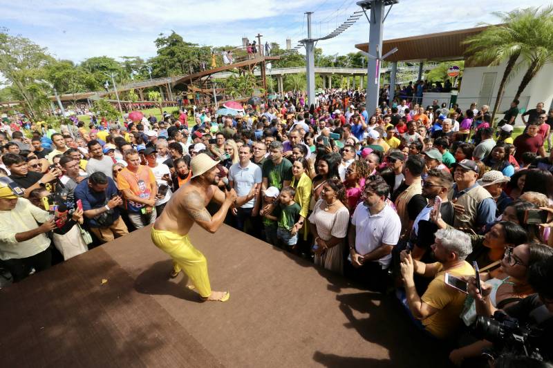 Aldo Rigoli e Elisa ficaram encantados com o Parque.Os amigos Aldo Rigoli e Elisa, moradores de outra cidade, também prestigiaram a abertura do parque. “A gente ficou completamente encantado pelo parque, porque não tínhamos noção da grandiosidade que era, sem contar que como artistas que somos, eu de teatro e Elisa da dança, é muito gratificante saber que tem um local desse, com toda essa estrutura. A cultura no Brasil é desvalorizada e na região norte é bem pior, nós sofremos mais ainda. Então, saber que existe um local como esse, com essa estrutura, é maravilhoso. Estamos encantados. Muito bonito”.