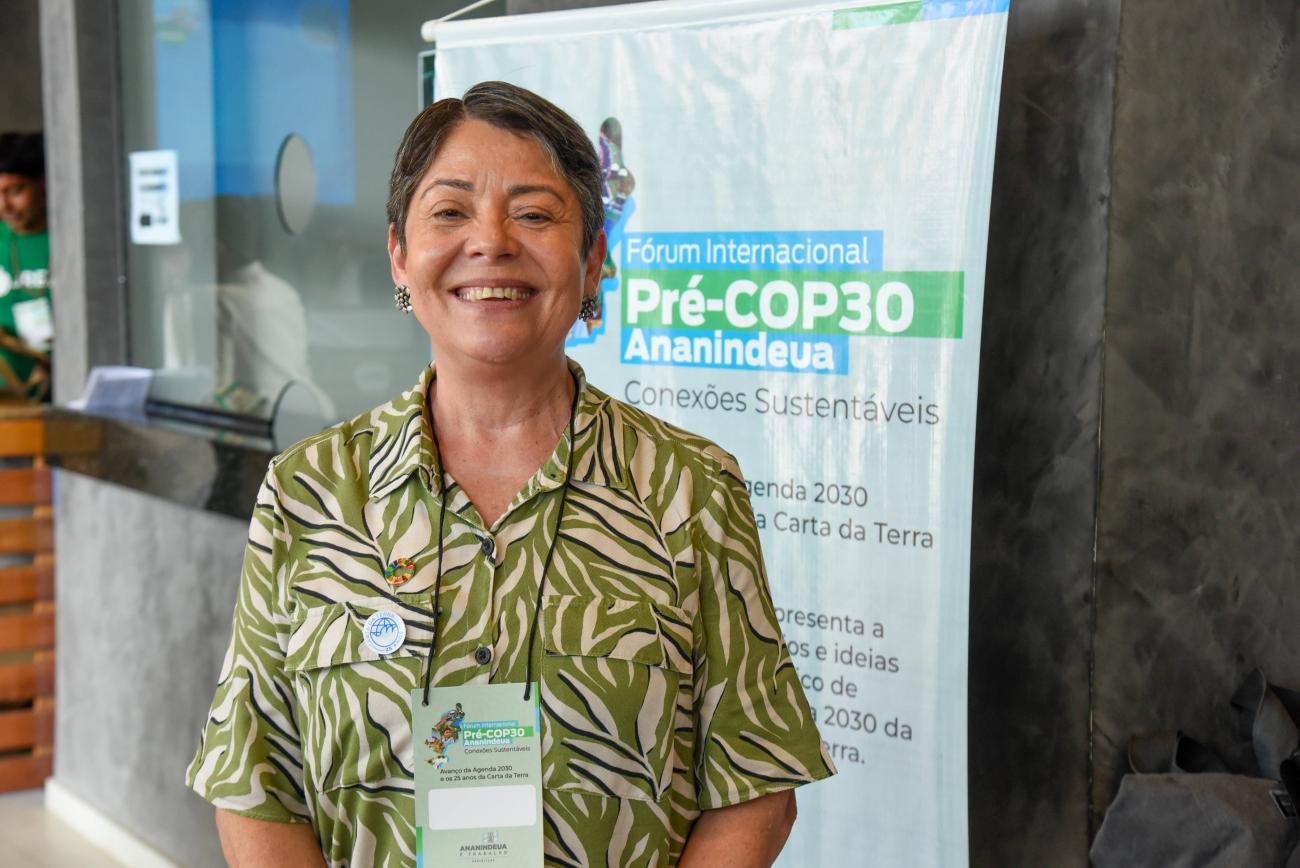 Mirian Vilela, representante da Carta da Terra Internacional. Em meio aos desafios e conquistas, Mirian Vilela, representante da Carta da Terra Internacional, enxerga em Ananindeua um potencial exemplo. "Quando a gente fala de sustentabilidade, muito é resolvido a nível local e para isso se requer vontade política", disse. "Eu quero felicitar Ananindeua pelo compromisso de trazer a sustentabilidade à prática e ser um referente de como pode ser transformado um município que seja um farol no caminho para um mundo mais justo, sustentável e pacífico”, falou Mirian.