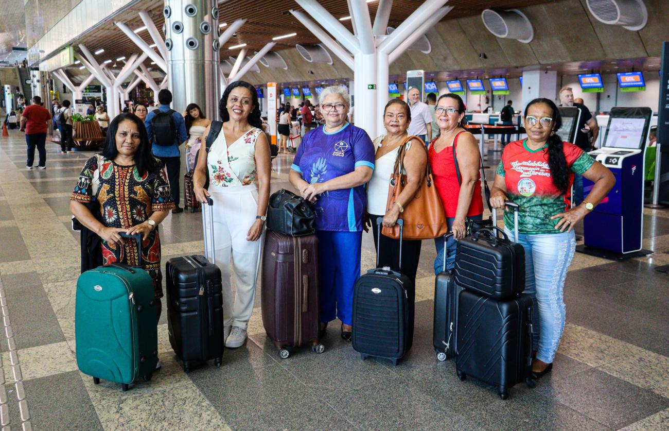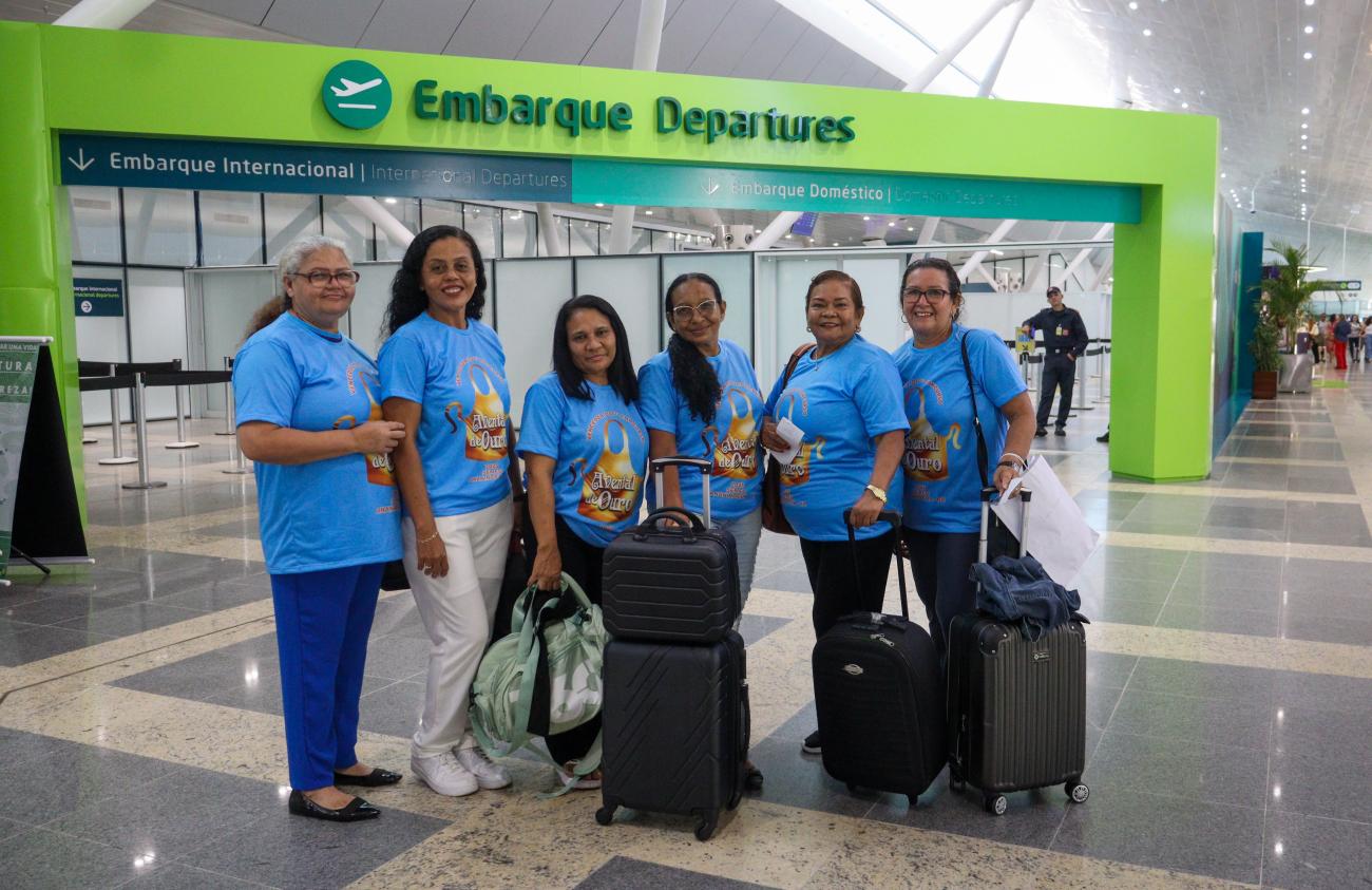 Vencedoras do concurso "Avental de Ouro".No aeroporto, o clima foi de ansiedade, alegria e emoção. Seis manipuladoras de alimentos da rede municipal de Ananindeua, vencedoras do concurso "Avental de Ouro", se prepararam para uma viagem a Fortaleza, uma experiência inédita para muitas delas, que nunca tinham viajado de avião.