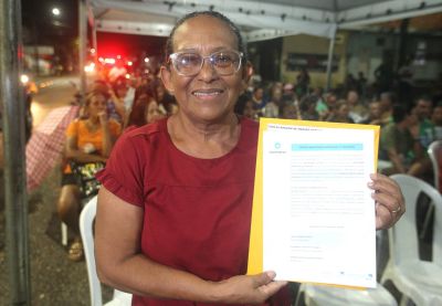 Dona Maria Fernanda Nazaré recebendo o título de propriedade.“Esperei mais de 30 anos, mas agora tenho orgulho de dizer que tenho o título de propriedade. Só tenho a agradecer à Prefeitura. Serei eternamente grata por essa gestão ter melhorado bastante a vida da gente, trazendo dignidade e melhorias para a comunidade Nova Esperança.”