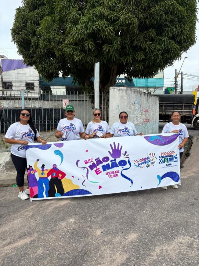 Equipe técnica municipal da Casa da Mulher Brasileira (CMB) na campanha “Não é Não”.Com a chegada do Carnaval, a equipe técnica municipal da Casa da Mulher Brasileira (CMB), intensificou as ações de conscientização sobre o respeito às mulheres e o combate ao assédio. No sábado, 07, as colaboradoras da CMB estiveram na Avenida Arterial 18 e na feira coberta da Cidade Nova IV, realizando panfletagem e orientações à população.