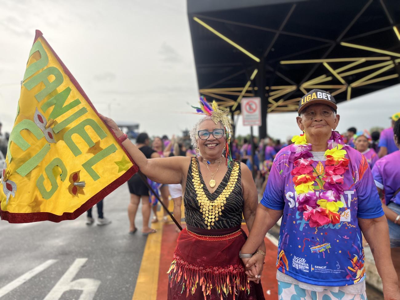 Soraya Corrêa, 63 anos.Entre os foliões, dona Soraya Corrêa, de 63 anos, do CRAS Complexo do VI, não ficou parada. Com um sorriso largo, ela fez questão de participar. “O SEMCAT Folia foi muito bom. Nós dançamos, nós cantamos. Foi a maior alegria que tivemos nessa nossa idade, foi maravilhoso. Palmas para a SEMCAT”, disse, enquanto arriscava alguns passos ao som da marchinha.