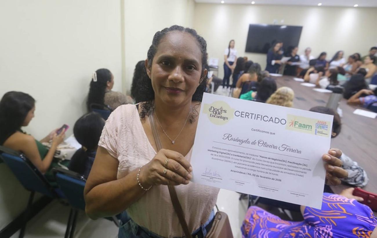 Rosângela Ferreira recendo o certificado de ″Marketing Digital″.A felicidade de Rosângela Ferreira é mostrada com um sorriso. A autônoma de 57 anos está entre os empreendedores que receberam a certificação do projeto “Doces que Encantam”. Moradora do bairro Aurá, na zona sul de Ananindeua, ela trabalha com a produção de doces e salgados há pelo menos três anos e, agora, com a qualificação profissional, pretende expandir o próprio negócio.